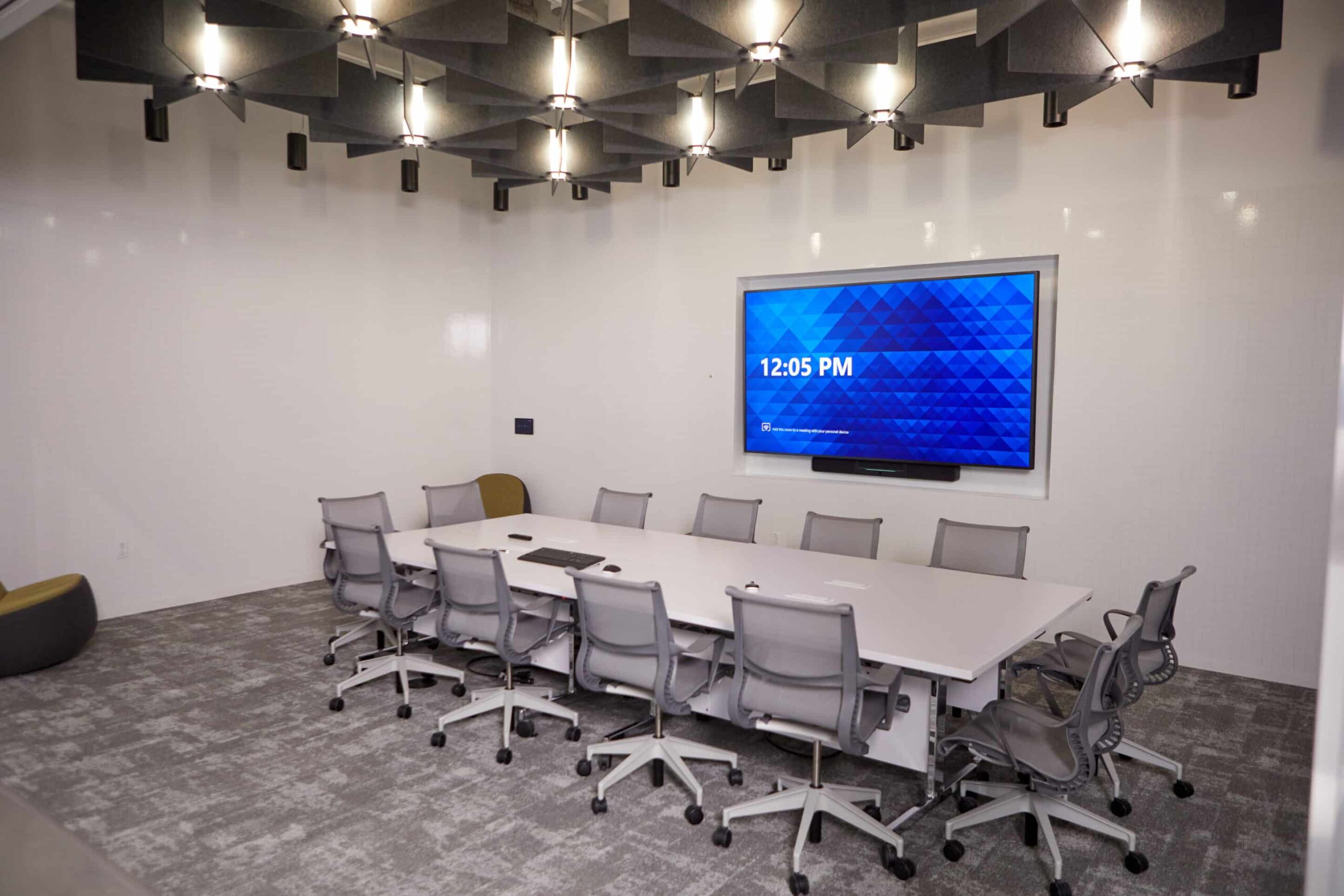 Los estándares tecnológicos incluían Microsoft Teams, paneles de control Crestron Mercury y Flex, Barco ClickShare, cámaras Logitech y Huddly, videowalls NanoLumens y pantallas Samsung y LG. Las salas se equiparon con micrófonos Shure y altavoces Crestron para garantizar la equidad de la reunión para todos los participantes. Se instalaron paneles de programación Crestron fuera de las salas de conferencias, para que los empleados pudieran ver fácilmente la disponibilidad de salas y reservar espacio para sesiones de colaboración improvisadas.